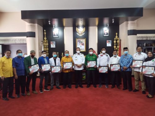 LUWU,MENARAINDONESIA.com-Bupati Luwu, H Basmin Mattayang bersama Kepala Badan Kesbangpol, H Alim Bachry, menerima kedatangan Ketua dan Bendahara dari 12 DPC Partai Politik Kabupaten Luwu diruang kerjanya, kompleks perkantoran Bupati Luwu, Kelurahan Senga Kecamatan Belopa, Kamis (17/06/2021).