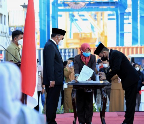 MAKASSAR,MENARAINDONESIA.com-Wali kota Makassar Moh. Ramdhan “Danny” Pomanto didampingi Wakil Wali kota Fatmawati Rusdi melantik 16 pejabat eselon ll lingkup pemerintah Kota Makassar. Di dermaga Pelabuhan Soekarno-Hatta Makassar. Senin (26/07/2021).