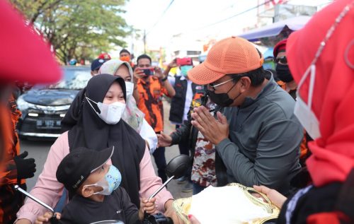 MAKASSAR,MENARAINDONESIA.com-Wali Kota Makassar, Moh. Ramdhan ‘Danny’ Pomanto membagikan masker kepada paengendara yang lewat di depan pasar Antang, Kecamatan Manggala, Minggu (15/08/2021).