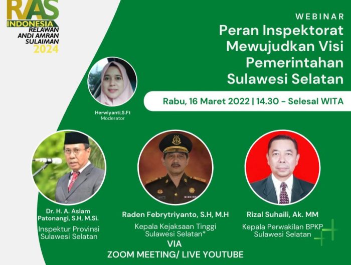 MAKASSAR,MENARAINDONESIA.com-Relawan Andi Amran Sulaiman (RAAS) rencana menggelar Web Seminar (Webinar) dengan tema “Peran Inspektorat Mewujudkan Visi Pemerintahan Sulawesi-selatan (Sulsel). Kegiatan tersebut akan dilaksanakan pada Rabu, 16 Maret 2022 melalui Aplikasi Zoom Meeting dan Live Streaming YouTube.