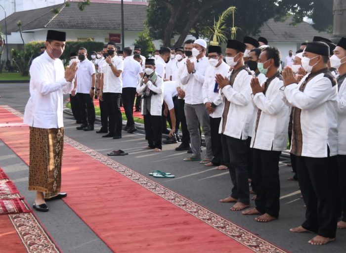 YOGYAKARTA,MENARAINDONESIA.com-Presiden RI Joko Widodo (Jokowi) dan Ibu Iriana Joko Widodo melaksanakan salat Idul Fitri di halaman Gedung Agung, Istana Kepresidenan Yogyakarta, Senin (02/05/2022), bertepatan dengan 1 Syawal 1443 Hijriah.