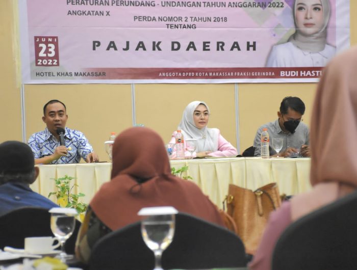 MAKASSAR,MENARAINDONESIA.com-Anggota Dewan Perwakilan Rakyat Daerah (DPRD) Kota Makassar, Budi Hastuti menggelar Sosialisasi Peraturan Daerah (Perda) Nomor 2 Tahun 2018 tentang Pajak Daerah, di Hotel Khas Makassar, Jl Andi Mappanyukki, Kamis (23/06/2022).
