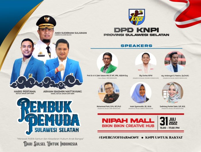 Berdasarkan info kepanitiaan, kegiatan tersebut mengangkat tema “Merawat Politik Santun dan Kesadaran Hukum Anak Bangsa” dan akan berlangsung di Nipa Mall, Cafe Bikin Bikin Creative Hub Lantai 3, Makassar, pada pukul 15.00 – 17.00 WITA, Minggu (31/07/2022).