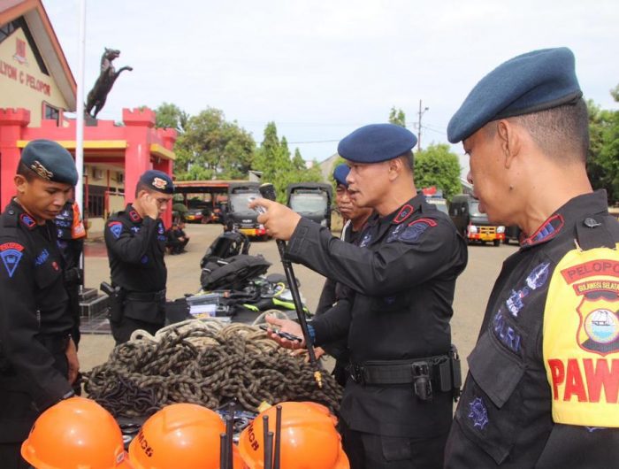 BONE,MENARAINDONESIA.com-Dalam rangka mengantisipasi dampak perubahan cuaca yang berpotensi menimbulkan bencana alam, Batalyon C Pelopor Satbrimob Polda Sulsel menggelar apel kesatuan pengecekan personel dan peralatan SAR di Mako Batalyon C Pelopor Satbrimob Polda Sulsel jalan M.H. Thamrin no. 70 Watampone, Sabtu (29/10/2022 ).