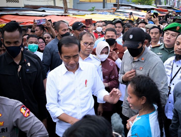 Indira, bersama Danny Pomanto mendampingi Joko Widodo menyapa dan membagikan bantuan sosial (Bansos) kepada para pedagang satu persatu di sepanjang lapak yang berbaris.