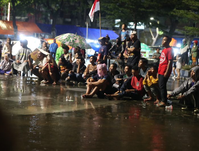 Bermodalkan spanduk berukuran 3×1 meter yang digunakan sebagai alat berteduh. Beberapa warga juga menggunakan mantel dan jaketnya sebagai pelindung kepalanya dari guyuran hujan, masyarakat Makassar memadati area Tugu Adipura Pantai Losari.